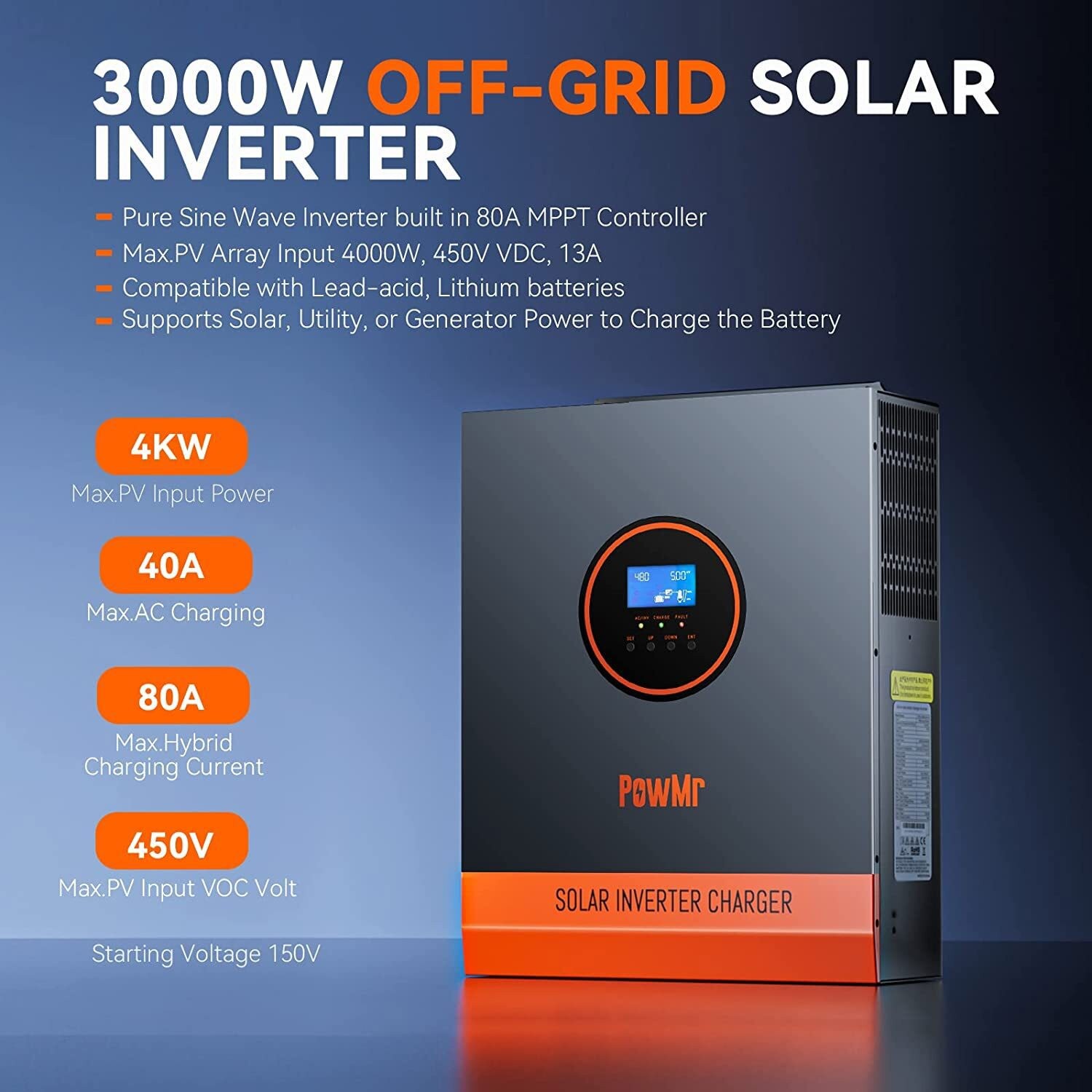 - 【Technical Parameters】3KW Solar Inverter accept Max 4000W /450V solar power and AC input 90-140Vac; Peak power: 6000VA; MPPT Voltage Range: 120-450Vdc, Max PV Output Power: 4000W. Max Current: 80A.