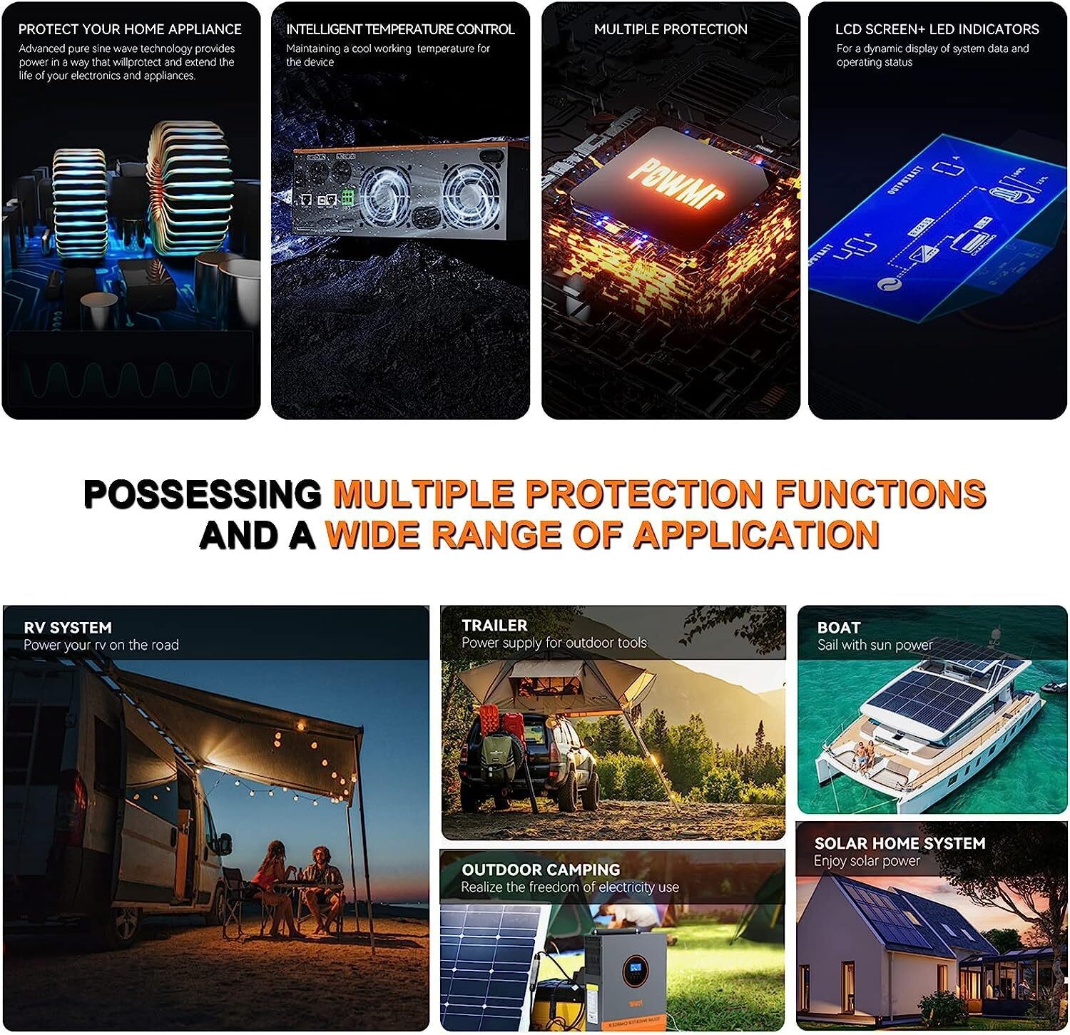 - 【Multiple Protection Functions】Multiple Protection Functions】LCD display design and 3 LED indicators dynamically display system data and operating status for easy viewing, while the inverter also has short circuit protection, overload protection, reverse protection, overvoltage, and under voltage protection, which greatly ensures your circuit and power safety.