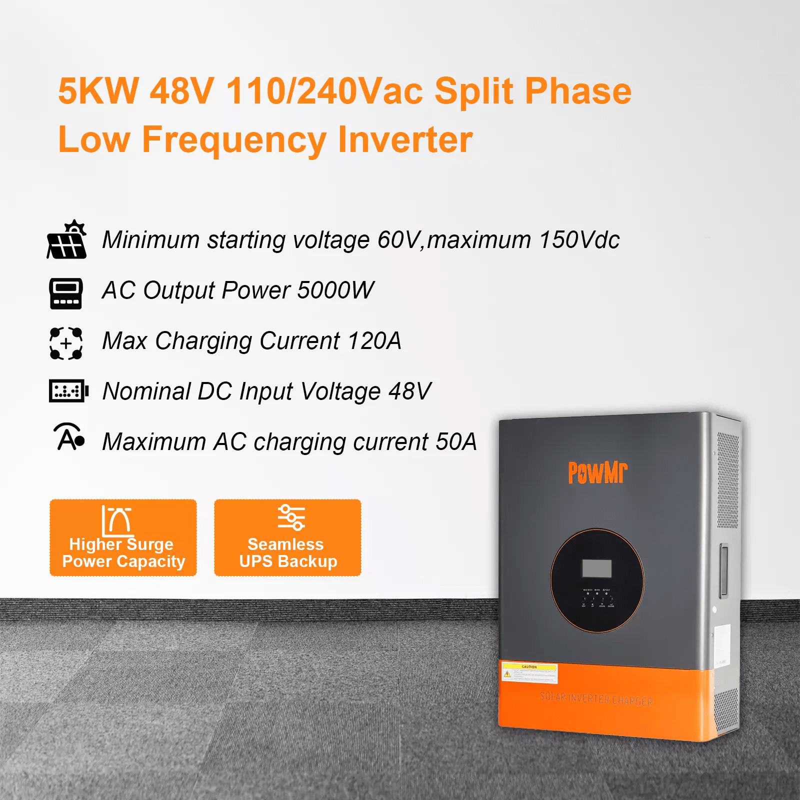 5KW 48V Hybrid Solar Inverter 110V/220V Split Phase 120A Controller Peak 15000WAbout this item【Low Frequency Off Grid Inverter】5000W low-frequency pur