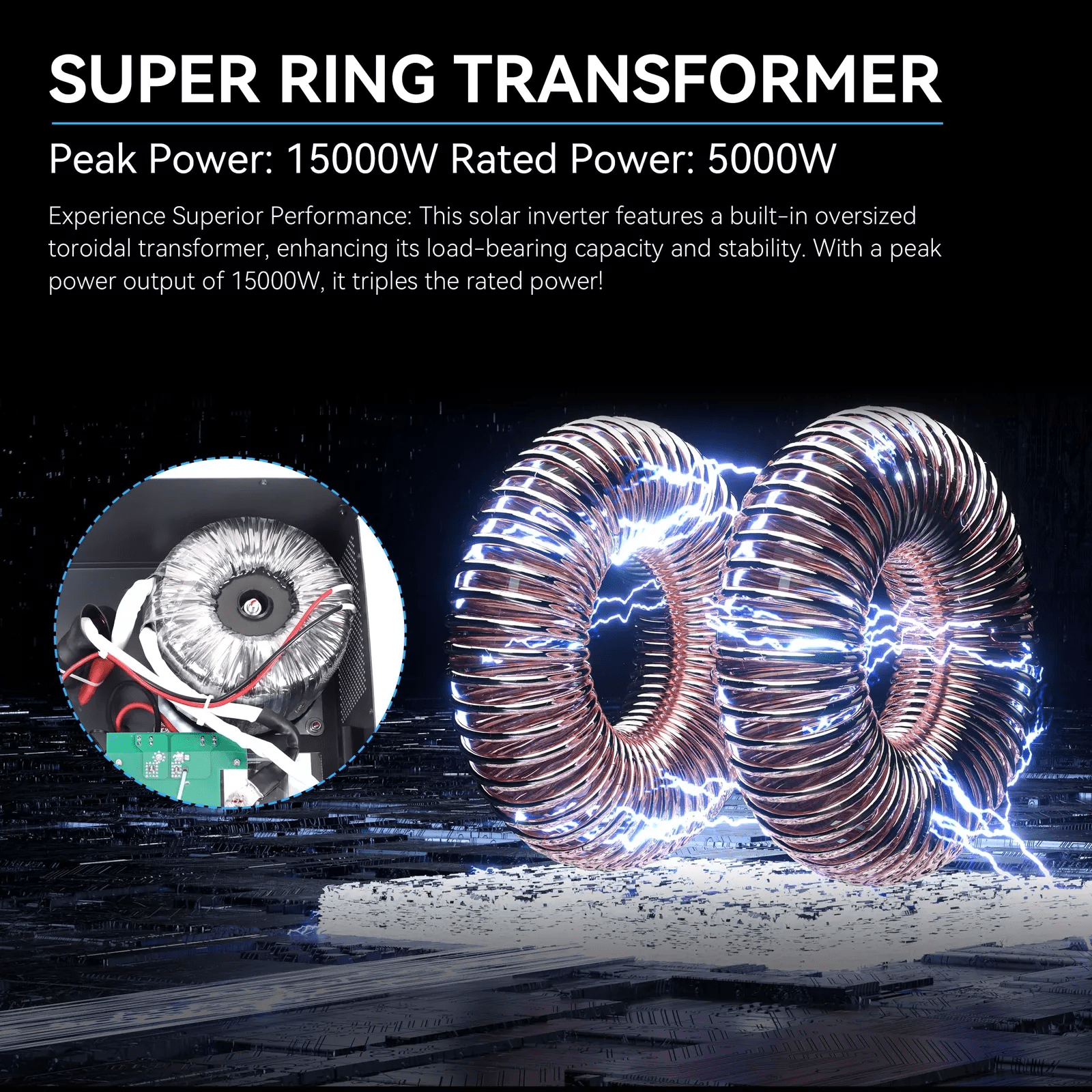 • Low Frequency Off Grid Inverter】5000W low-frequency pure sine wave inverter, 3 times peak power, Peak 15000W, powerful load capacity, can cope with the start-up needs of high-power equipment. The low-frequency design with toroidal transformer ensures the stability and reliability of the operation of the equipment. Suitable for domestic, industrial and other environments, providing users with reliable power conversion.