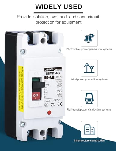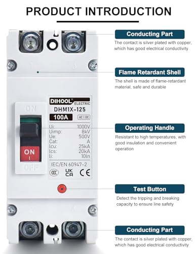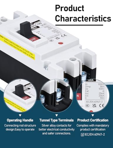 About this item Function: Thermal Magnetic Trip, circuit overload protection, isolation circuit, circuit short circuit protection 30% silver content in moving contacts, 45% silver content in stationary contacts Working voltage: DC 12V~500V AC 90~480V short-circuit breaking capacity 25kA Size:144MM x 108MM x 203MM, It needs to be installed on the panel through screws Suitable for DC application such as photovoltaic / UPS / battery / Datacenter etc.